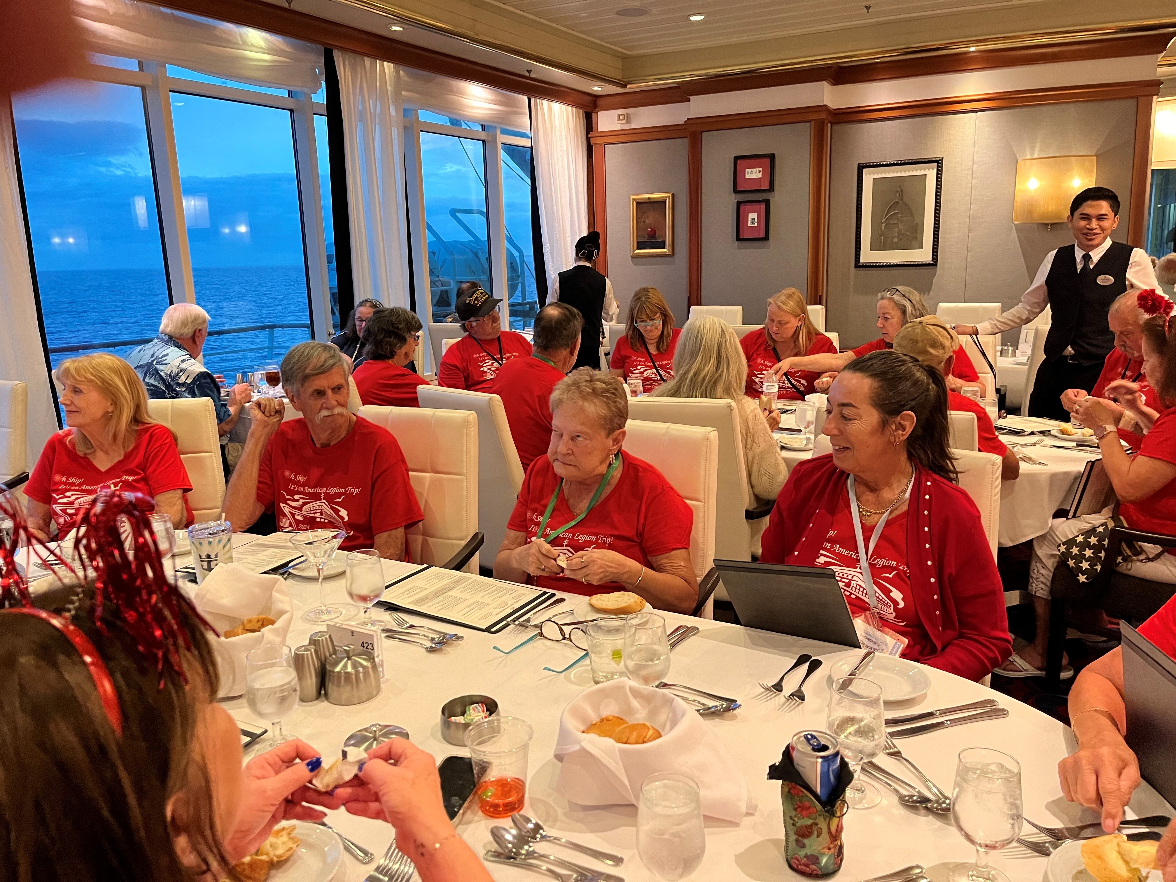 American Legion Post 321 Cooper City enjoyed their 2024 cruise on RCL’s Freedom of the Seas. They started with picking up their travel bags and networking at the ‘sail away’ meeting. Then they met for a group dinner. They looked great in their red and white attire. During the cruise, they enjoy watching football in the sports lounge.